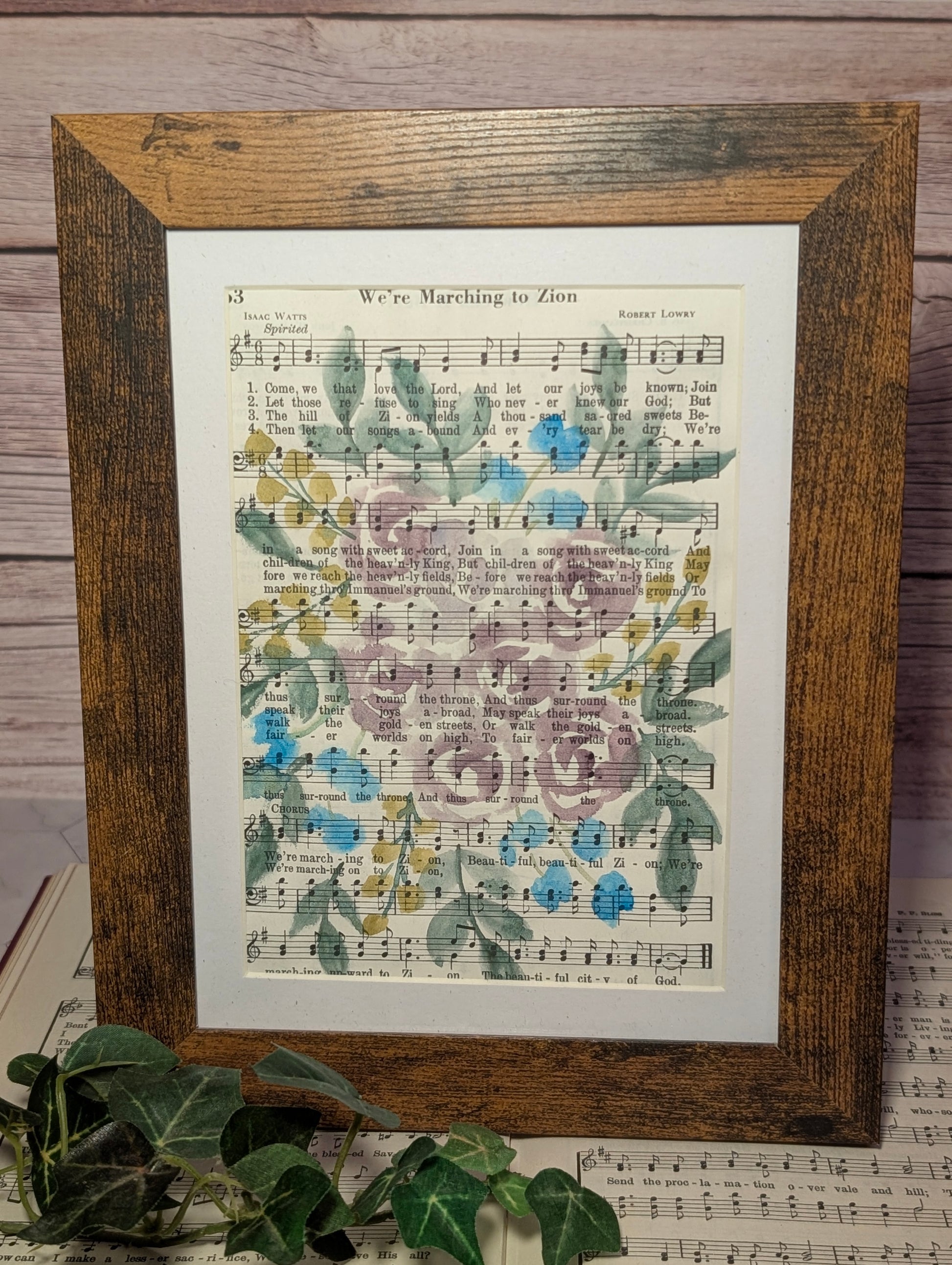 This original watercolor painting is hand-painted on a page taken directly from a vintage hymnal, blending timeless faith with delicate artistry. It comes framed in a 6x8 frame, ready to add a meaningful touch of color and inspiration to your home or gift to someone special.